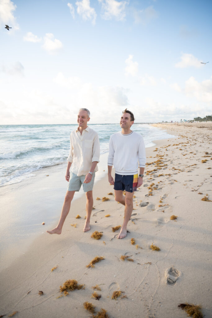Andrew and Will move through the world with a natural ease rooted in intelligence, kindness, and genuine affection. Their connection carries a quiet sophistication, softened by laughter that comes quickly and often. Whether strolling through sunlit corridors of the Miami Edition or pausing with the Atlantic Ocean stretching endlessly behind them, their engagement photos felt intentional, warm, and deeply personal—two people fully at home with one another.
